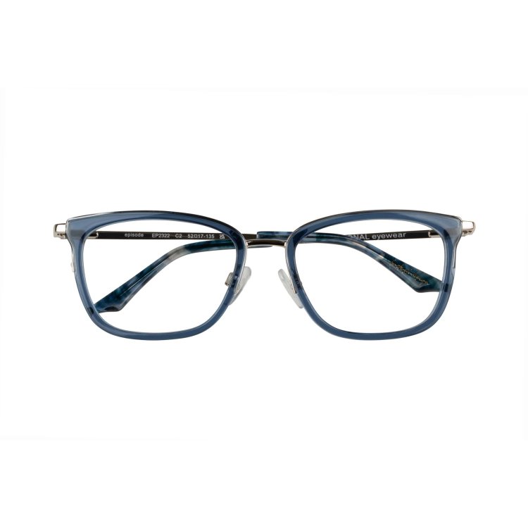Combination stainless steel and acetate rectangular eye shape front featuring British design foil branding. Completed with Episode signature wave tip plate