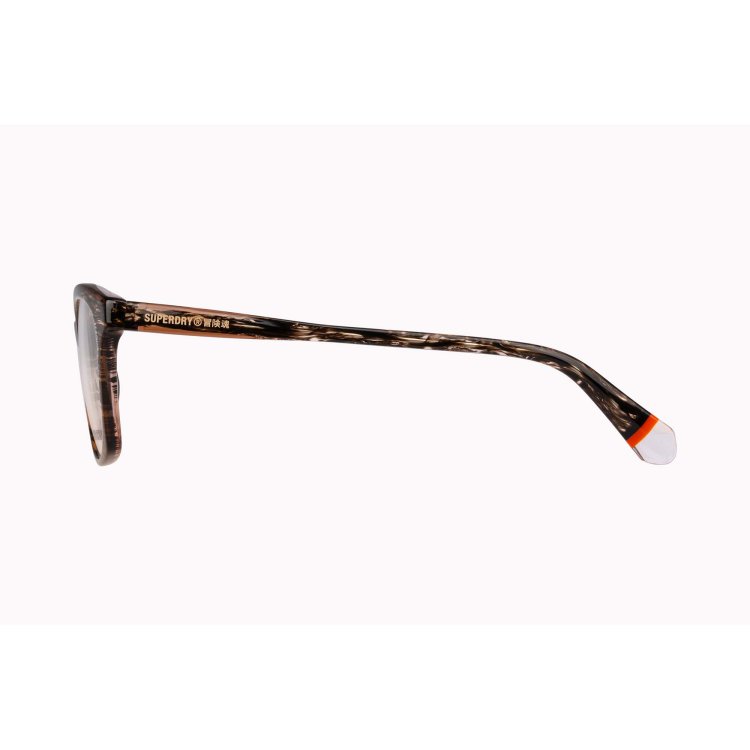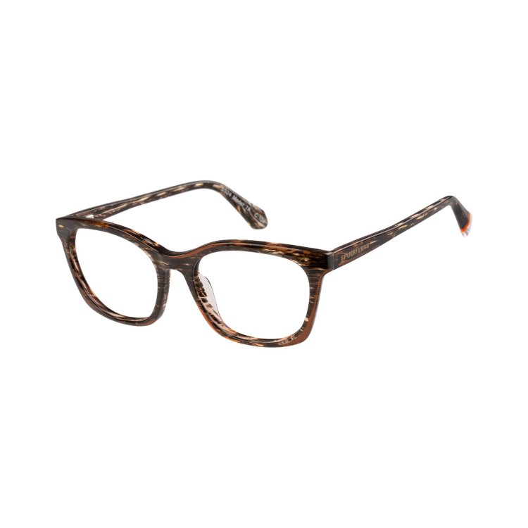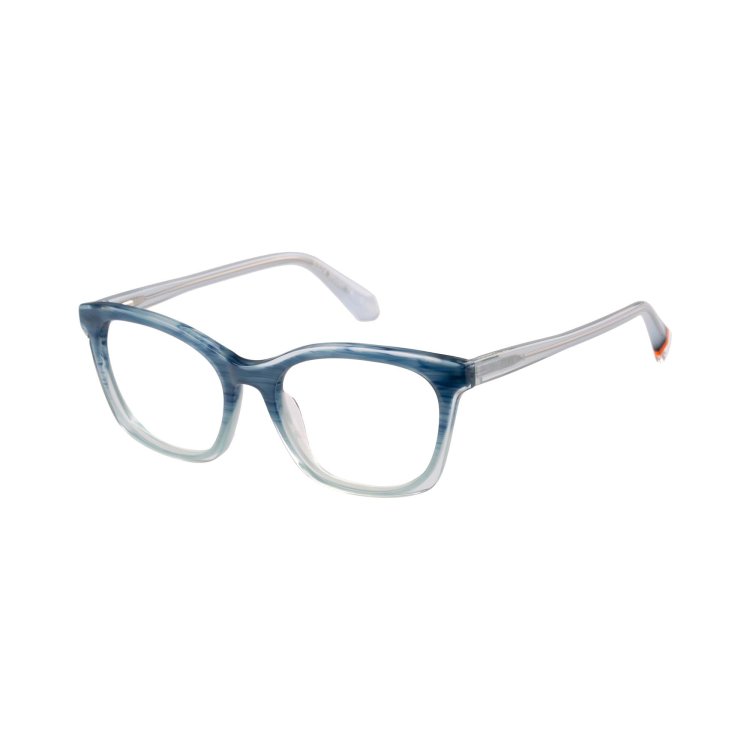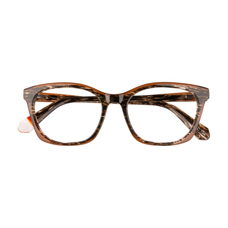 Soft cat-eye silhouettes are given the modern touch with dual colour laminated fronts and temples in horn effect acetate and tonal crystal edges.