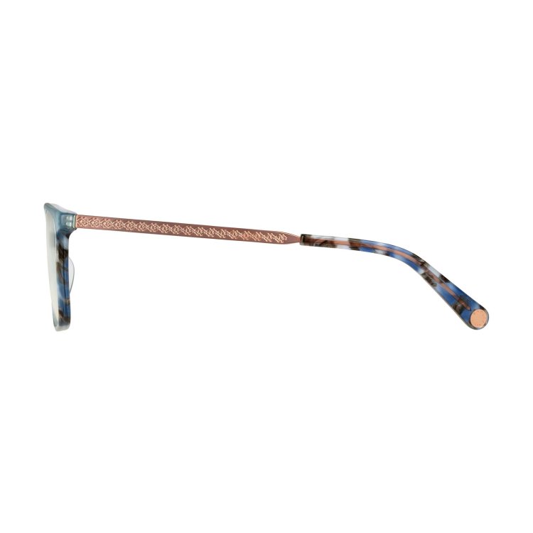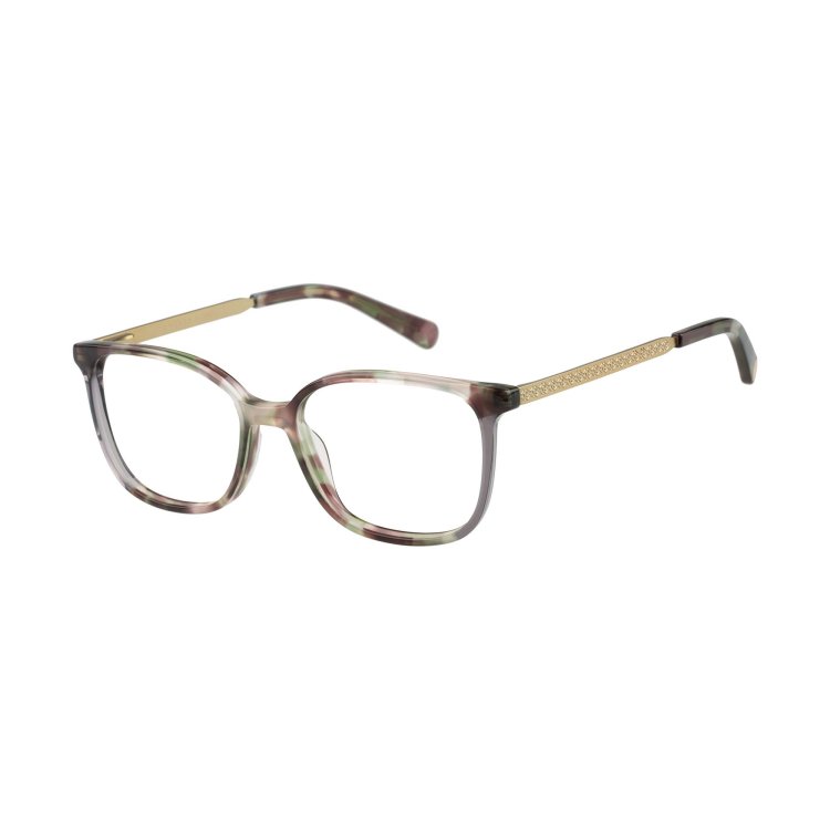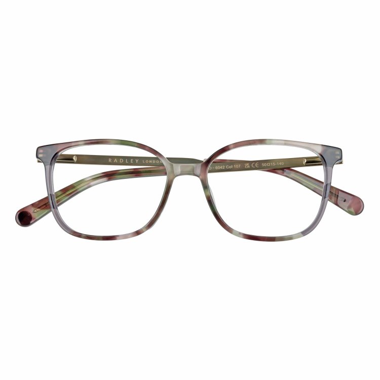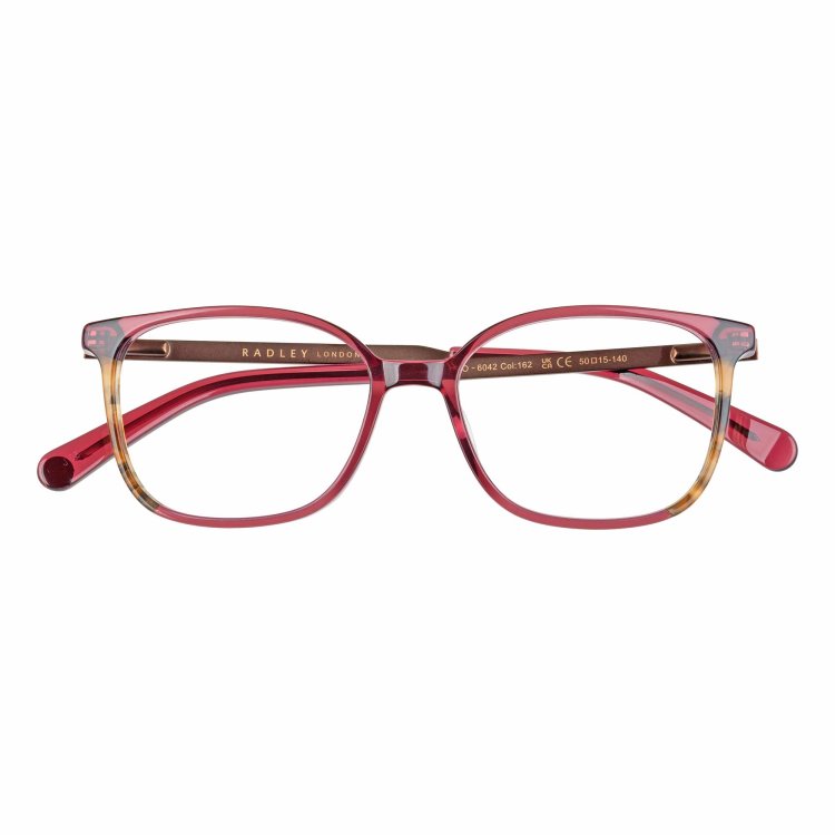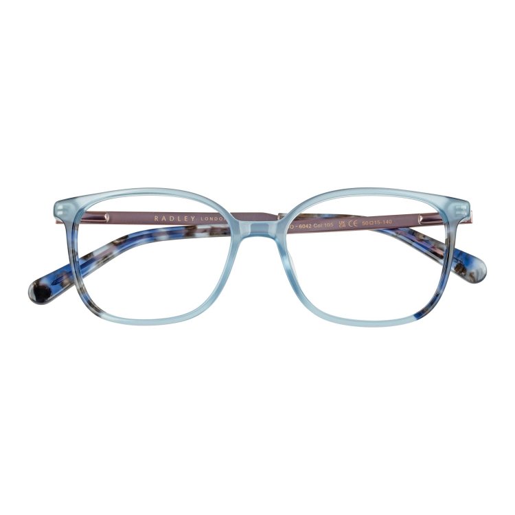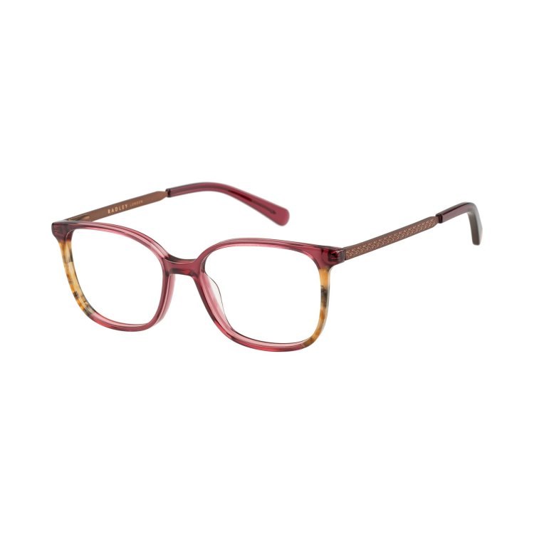 Soft square eye combination style with front laminations. Metal temples featuring debossed Radley Heirloom dog logo.